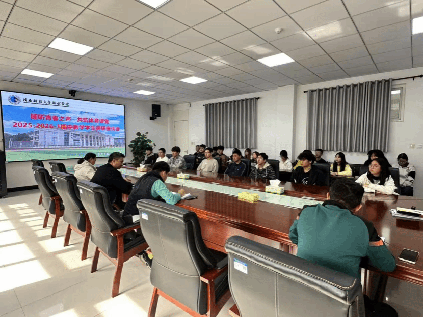 为进一步提升体育教学质量及丰富校园体育文化,2025年10月31日下午,我校于会议室召开了2025-2026学年第一学期期中教学学生调研座谈会。本次会议以“倾听青春之声 共筑体育课堂”为主题,由体育部雷秀萍主任主持,体育部刘涛部长、杨顺成主任、教学秘书麻晋忻、专任教师曲昌航及20余名学生代表共同参与。