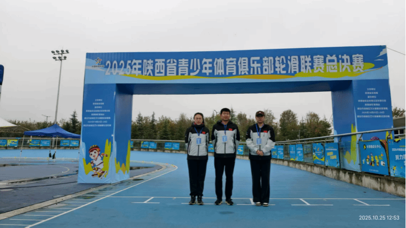 2025 年 10 月 25 日至 26 日,陕西省青少年体育俱乐部轮滑联赛总决赛在阎良区石川河极限运动中心精彩落幕。作为本年度轮滑联赛的压轴之战,赛事规模空前,吸引了全省 10 个地市 33 支代表队、385 名年龄跨度从 3 岁至 18 岁的运动员同台竞技,超过 2500 名观众齐聚现场呐喊助威,气氛热烈非凡。我校杨顺成、梁方梅、范丹丹三位老师受邀担任本次赛事执裁工作。三位教师以严肃认真的工作态度、专业精准的执裁能力,实现全程零失误,为赛事的公平公正有序开展筑牢坚实保障。